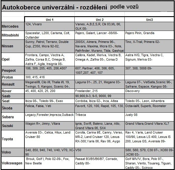 Alfa Romeo: 155,156,159 Audi: A2,RS4, A6, 100, Q5 09- BMW: 1er,3er 07, 5er 07, X3 07,X5 07, X6 08-, X1 09- Citroen: BX, AX, C15, Berlingo, MX, C1, C5, C4, C4 Picasso Chrysler: Neon, Stratus, Vision Chevrolet Daewoo: Nubira, Nexia, Evanda, Kalos, Leganza, Epica, Captiva, Spark, Aveo Dacia: Super Nova, Logan Fiat: Stilo, Idea, Punto, Croma, Punto Grande, Sedici, Bravo 07, Punto Evo 09- Ford: Mondeo 07-, Escort, Probe Honda: Prelude, CRX, Legend, Accord, Civic, HR-V, CR-V 06 Hyundai: Sonata, XG-30 - 35, Teracan, Lantra, Matrix, Accent, Santa F‚, Elantra, i30 Kia: Schuma, Rio,Magentis,Sephia, Opirus,Clarus, Carnival, Schuma II, Cerato, Ceed Lada: Niva,2105 Mazda: MX-6, MX-3, Premacy, MPV, 323 98-, Mazda 5/6, 626 Mercedes: Vaneo, A,B,E,S,R, Clk 03,ML 06, GLK 08- Mitsubishi: Pajero, Galant, Lancer -08/08- Nissan: 200SX, Almera, Primera 96-, Navara, Maxima, Micra 03-, Note, Pathfinder, Murano, Tiida, Qashqai Opel: Calibra, Kadet, Meriva, Vectra B, Omega A, Zafira 05-, Corsa D Peugeot: 607, Partner, 406, 306, 605, 1007,207, 407, 107 Renault: Laguna 01-, 25, 21, Megane 03- Rover: Freelander, 215 Saab: 90,900,9-3, 9-5, 9000, 99 Seat: Cordoba, Ibiza 02-, Inca, Altea Škoda: Favorit, 120, 100, Rapid, 105, 130 Subaru: Tribeca Suzuki: Ignis, Swift, Baleno, Liana, Alto, Grand Vitara 06, SX4 Toyota: Corolla, Carina II/E, Camry, Verso, MR-2, Land Cruiser 120, Lexus RX-300,Yaris 06, Rav 06, Aygo Volvo: V50 Volkswagen: Passat B3/B5/B6/B7, Corrado, Caddy 80-