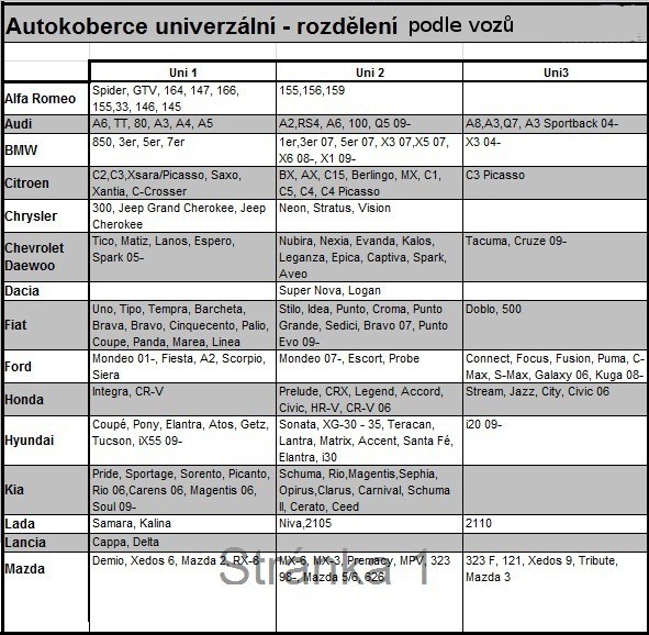 Alfa Romeo: 155,156,159 Audi: A2,RS4, A6, 100, Q5 09- BMW: 1er,3er 07, 5er 07, X3 07,X5 07, X6 08-, X1 09- Citroen: BX, AX, C15, Berlingo, MX, C1, C5, C4, C4 Picasso Chrysler: Neon, Stratus, Vision Chevrolet Daewoo: Nubira, Nexia, Evanda, Kalos, Leganza, Epica, Captiva, Spark, Aveo Dacia: Super Nova, Logan Fiat: Stilo, Idea, Punto, Croma, Punto Grande, Sedici, Bravo 07, Punto Evo 09- Ford: Mondeo 07-, Escort, Probe Honda: Prelude, CRX, Legend, Accord, Civic, HR-V, CR-V 06 Hyundai: Sonata, XG-30 - 35, Teracan, Lantra, Matrix, Accent, Santa F‚, Elantra, i30 Kia: Schuma, Rio,Magentis,Sephia, Opirus,Clarus, Carnival, Schuma II, Cerato, Ceed Lada: Niva,2105 Mazda: MX-6, MX-3, Premacy, MPV, 323 98-, Mazda 5/6, 626 Mercedes: Vaneo, A,B,E,S,R, Clk 03,ML 06, GLK 08- Mitsubishi: Pajero, Galant, Lancer -08/08- Nissan: 200SX, Almera, Primera 96-, Navara, Maxima, Micra 03-, Note, Pathfinder, Murano, Tiida, Qashqai Opel: Calibra, Kadet, Meriva, Vectra B, Omega A, Zafira 05-, Corsa D Peugeot: 607, Partner, 406, 306, 605, 1007,207, 407, 107 Renault: Laguna 01-, 25, 21, Megane 03- Rover: Freelander, 215 Saab: 90,900,9-3, 9-5, 9000, 99 Seat: Cordoba, Ibiza 02-, Inca, Altea Škoda: Favorit, 120, 100, Rapid, 105, 130 Subaru: Tribeca Suzuki: Ignis, Swift, Baleno, Liana, Alto, Grand Vitara 06, SX4 Toyota: Corolla, Carina II/E, Camry, Verso, MR-2, Land Cruiser 120, Lexus RX-300,Yaris 06, Rav 06, Aygo Volvo: V50 Volkswagen: Passat B3/B5/B6/B7, Corrado, Caddy 80-