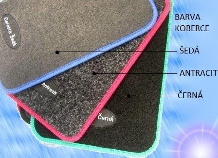 Šijeme koberce na míru dle značky vozu, možnost vybrání koberce v barvách šedá, antracit, černá (obr.2). Možnost olemování koberce v barvách černá, šedá(stříbrná), modrá, zelená, červená, žlutá aj. Dále na předních kobercích originální výšivka s logem automobilky, která je zalisována do koberce. Možnost dokoupení fixace (tj. díry v koberci pro připevnění k podlaze). Celkem vzato je v ceně zahrnuto.