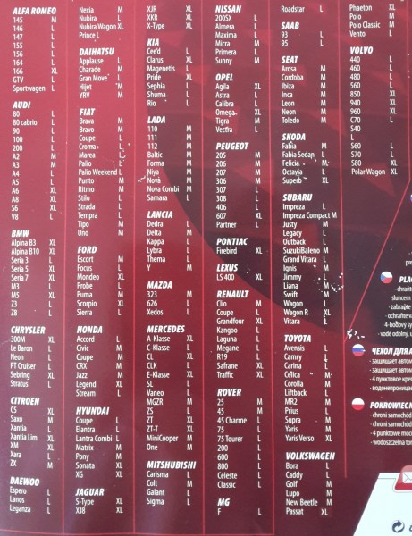 pasuje např. na Audi A4, A6 combi, BMW řady 3, 5 Touring, Ford Focus Turnier, Opel Astra combi, Renault Megane combi aj. U menších vozů překryje celé auto a stáhne se.