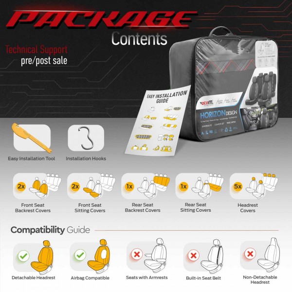 - potahy nemají výřezy pro pásy a zadní opěrky hlavy z důvodu jejich zamýšleného použití pro různé modely aut, potřebné otvory si po přesném osažení a montáži musíte udělat sami