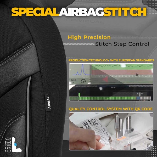 Standardní potahy mají certifikovaný AIRBAGový šev , díky kterému jsou přizpůsobeny pro vozy s bočními airbagy v sedadlech i pro standardní sedadla. Díky použití speciálního švu zcela pokrývají sedadla, aniž by narušovaly činnost AIRBAGů.