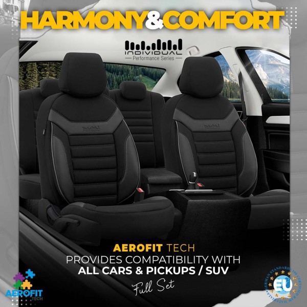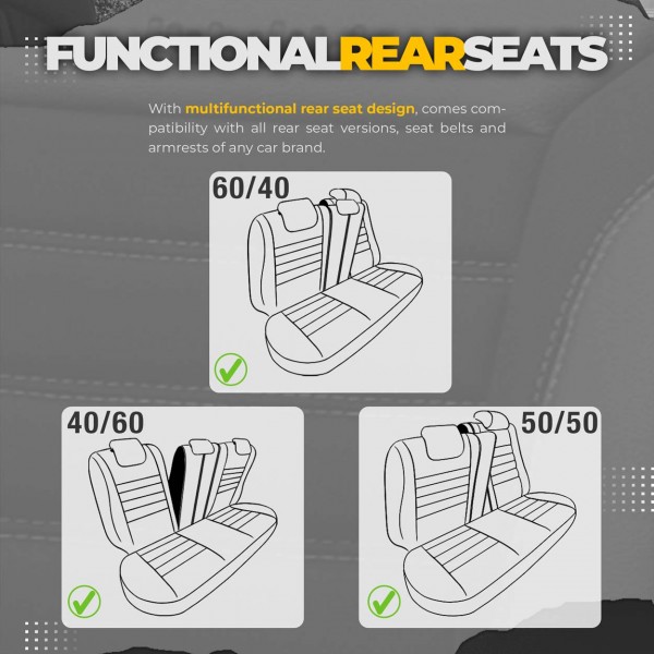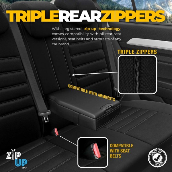 Potahy mají zámky v zadní pohovce, díky čemuž pasují na většinu sedadel dostupných na trhu (nedělené, nebo dělené vpravo a vlevo).