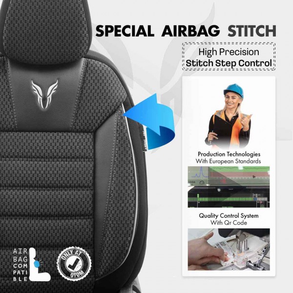- potahy mají mnohokrát testovaný a certifikovaný airbagový šev, díky čemuž jsou vhodné i pro vozy s bočními airbagy v sedadlech, díky použití speciálního švu zcela pokryjí sedadla, aniž by narušily práci airbagů