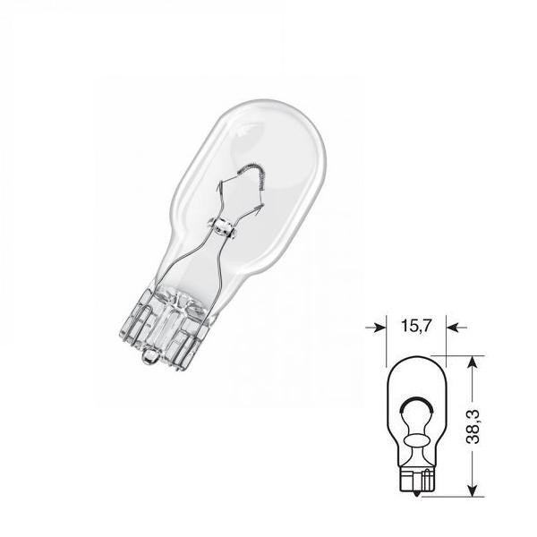 Celoskleněná žárovka 12V/16W, W2, 1x9,5d. Většinou osazena v brzdových a zadních světlech vozidel. Homologovaná.