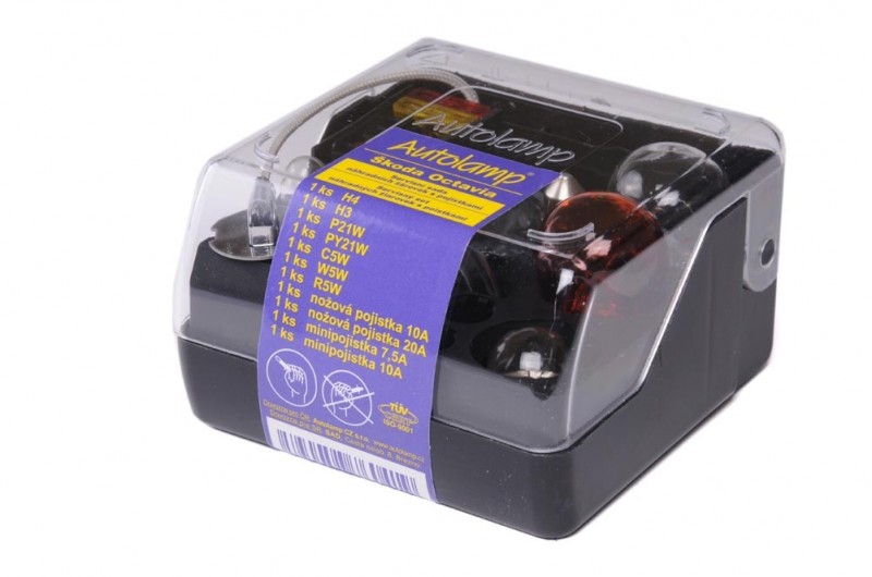 složení: 1ks H4 1ks H3 1ks PY21W 1ks P21W 1ks W5W 1ks R5W 1ks C5W 1ks nožová pojistka 10A 1ks nožová pojistka 20A 1ks mini pojistka 7,5A 1ks mini pojistka 10A
