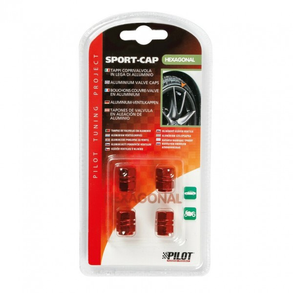 Univerzální hliníkové čepičky na ventilky, šestihranné, červené, sada 4ks od italské firmy Lampa.