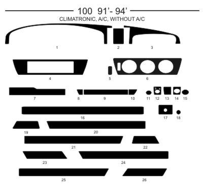 Dekor interiéru Audi 100, 1991-1994, climatronic, manuální klima, bez klimatizace, červený