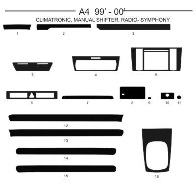 Dekor interiéru Audi A4, 1999-2000, climatronic, manuální řazení, rádio - Symphony, carbon