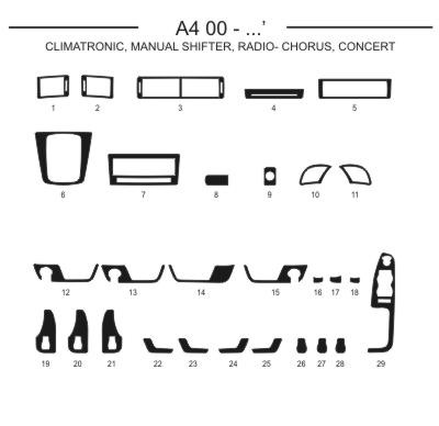 Plastický samolepící pryskyřicový dekor o síle 0,2-0,5mm. Jedná se o přesné výrobky na každý model vozu. Vzhledem k tomu, že se tyto výrobky vyrábějí na zakázku a objednávají ze zahraničí, prosíme o trpělivost. Dodací lhůta je cca 7-18dnů. Každý díl je samolepící a přesně vymodelován na danou část interiéru vozu. Polep je zalit v čiré pryskyřici silné cca 0,2-0,5mm, odolné poškrábání, či mytí chem. prostředky. Nevybledává, jako samolepka. Prosíme při objednání si dávejte pozor u středového dílu, který je u stejné značky vozu i vícekrát různý, podle výbavy. Podívejte se zda máte, či nemáte manuální klimatizaci, nebo climatronic. Rozdíly jsou někdy nepatrné, ale jsou. Například jeden otvor navíc pro spínač klimy, nebo jiné uspořádaní ovladačů u originálního autorádia, změna autorádia, manuální, či automatická převodovka apd. Sada je nalepena na folii ze které se daný díl odlepí a po zahřátí se lepí na určené místo. Změňte interiér svého vozu k nepoznání. Cena je za celou sadu, dle černobílého obrázku. Vzhledem k výrobě na zakázku, můžeme u starších a netipických vozů požadovat zálohovou platbu předem.
