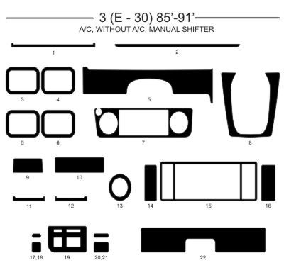 Dekor interiéru BMW E30 1985-1991 s klimatizací, bez klimatizace, manuální řazení, AL hliník