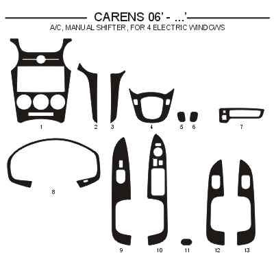 Dekor interiéru Kia Carens, 2006-, manuální klimatizace, manuální řazení, pro 4 el. okna, carbon standart