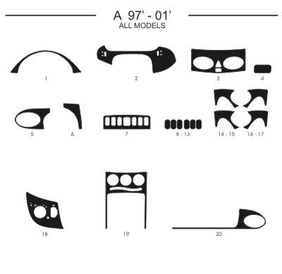 Plastický samolepící pryskyřicový dekor o síle 0,2-0,5mm. Jedná se o přesné výrobky na každý model vozu. Vzhledem k tomu, že se tyto výrobky vyrábějí na zakázku a objednávají ze zahraničí, prosíme o trpělivost. Dodací lhůta je cca 7-18dnů. Každý díl je samolepící a přesně vymodelován na danou část interiéru vozu. Polep je zalit v čiré pryskyřici silné cca 0,2-0,5mm, odolné poškrábání, či mytí chem. prostředky. Nevybledává, jako samolepka. Prosíme při objednání si dávejte pozor u středového dílu, který je u stejné značky vozu i vícekrát různý, podle výbavy. Podívejte se zda máte, či nemáte manuální klimatizaci, nebo climatronic. Rozdíly jsou někdy nepatrné, ale jsou. Například jeden otvor navíc pro spínač klimy, nebo jiné uspořádaní ovladačů u originálního autorádia, změna autorádia, manuální, či automatická převodovka apd. Sada je nalepena na folii ze které se daný díl odlepí a po zahřátí se lepí na určené místo. Změňte interiér svého vozu k nepoznání. Cena je za celou sadu, dle černobílého obrázku. Vzhledem k výrobě na zakázku, můžeme u starších a netipických vozů požadovat zálohovou platbu předem.
