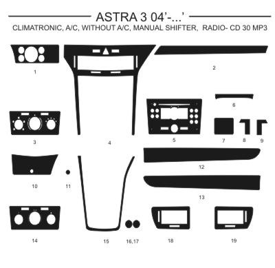 Dekor interiéru Opel Astra H 2004-2009, climatronic, manuální klima, bez klimatizace, manuální řazení, radio-CD 30MP3, carbon plus