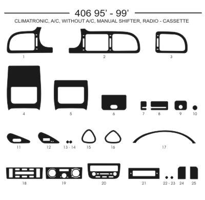 Dekor interiéru Peugeot 406, 1995-1999, s klimou i bez klimatizace, včetně climatronic, manuální řazení, radio na kazety , černý