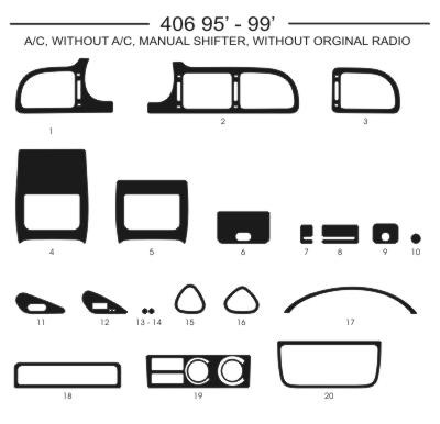 Dekor interiéru Peugeot 406, 1995-1999, s man. klimou i bez klimatizace, manuální řazení, bez originálního rádia, světlý mahagon