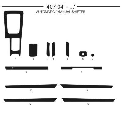 Dekor interiéru Peugeot 407, 2004-, dekory 2 sada, manuální i automatická převodovka, světlý mahagon