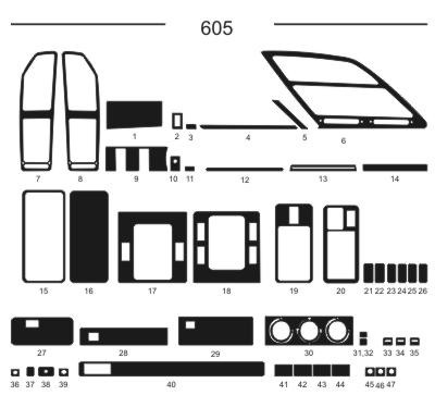 Plastický samolepící pryskyřicový dekor o síle 0,2-0,5mm. Jedná se o přesné výrobky na každý model vozu. Vzhledem k tomu, že se tyto výrobky vyrábějí na zakázku a objednávají ze zahraničí, prosíme o trpělivost. Dodací lhůta je cca 7-18dnů. Každý díl je samolepící a přesně vymodelován na danou část interiéru vozu. Polep je zalit v čiré pryskyřici silné cca 0,2-0,5mm, odolné poškrábání, či mytí chem. prostředky. Nevybledává, jako samolepka. Prosíme při objednání si dávejte pozor u středového dílu, který je u stejné značky vozu i vícekrát různý, podle výbavy. Podívejte se zda máte, či nemáte manuální klimatizaci, nebo climatronic. Rozdíly jsou někdy nepatrné, ale jsou. Například jeden otvor navíc pro spínač klimy, nebo jiné uspořádaní ovladačů u originálního autorádia, změna autorádia, manuální, či automatická převodovka apd. Sada je nalepena na folii ze které se daný díl odlepí a po zahřátí se lepí na určené místo. Změňte interiér svého vozu k nepoznání. Cena je za celou sadu, dle černobílého obrázku. Vzhledem k výrobě na zakázku, můžeme u starších a netipických vozů požadovat zálohovou platbu předem.