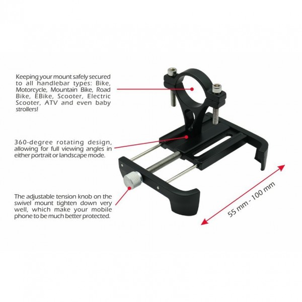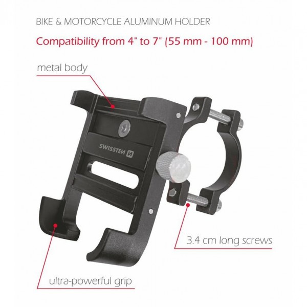 Kovový držák smartphonu 4-7", který se dá využít jak na kolo, tak i na motorku, čtyřkolku, elektrokolo atd. Baleno v blistru SWISSTEN.