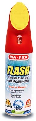 Flash je vynikající přípravek, který se používá i v profesionálních mycích centrech.Výhodou je jeho suchá pěna, výborné čistící schopnosti i výsledky. Jeho aktivní látky čistí textilní čalounění, kůže, koženky, Alkantary, koberečky apd. System Odor Stop pohlcuje i pachy ze zvířat, jídla, či nikotonu. Sprej je posílen horním kartáčkem .