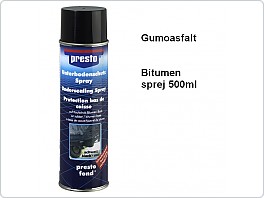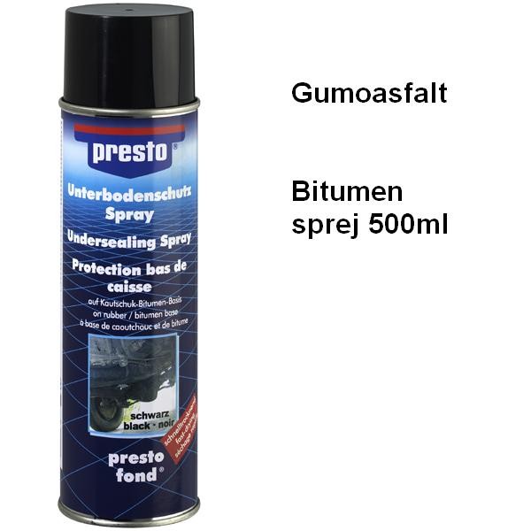 presto Ochrana podvozku a karoserie (Bitumen) tvoří odolnou elastickou vrstvu na spodních částech karoserie vozů, dopravních prostředků, všech typů motorových vozidel. Chrání podvozek proti mechanickému i chemickému namáhání jako jsou odlétající kaménky,posypové soli, vody, rzi a povětrnostním vlivům.