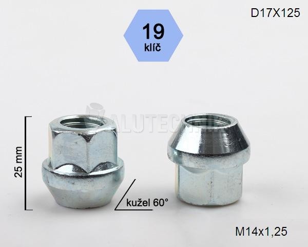 Kolová matice M14x1,25, dosedací plocha kužel 60°, délka závitu 25 mm, pevnostní matice určená k uchycení disků k automobilu. Pro klíč 19mm.