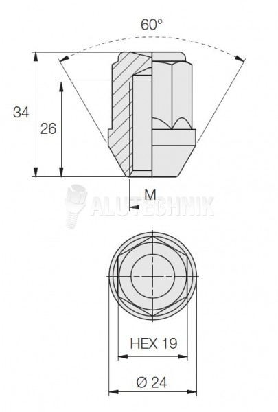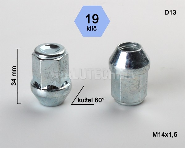 Kolová matice M14x1,5x34, dosedací plocha kužel 60°, délka závitu 32 mm, pevnostní matice určená k uchycení disků k automobilu. Pro klíč 19mm. Výška 34mm.