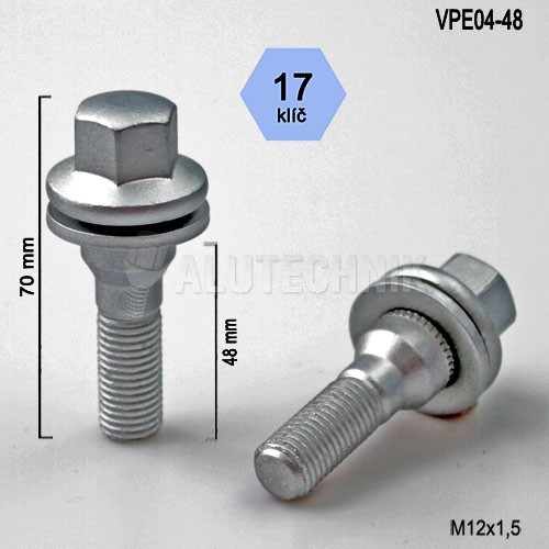 Kolový šroub s plochou dosedací plochou a podložkou. Závit 12x1,5 !!! Pouze pro P107, P108, Citroen C1, Toyota Aygo. Většina ostatních vozů stejné značky mají závit 1,25, pouze tyto modely mají závit 1,5. Výška šroubu 70mm, určeno většinou pro uchycení kol s rozšiřovacími podložkami. Hlava šroubu je pro klíč 17.