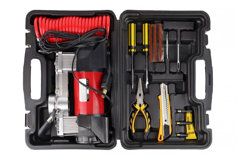 Silný kovový dvoupístový kompresor s manometrem. Kompresor je určen pro foukání kol, míčů, pontonů, bazénů a jiné, díky třem různým koncovkám ventilů v soupravě. Poradí si s huštěním velkých kol 4x4 - SUV - Van - Truck - Camping.