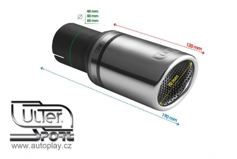 Univerzální koncovka výfuku z ušlechtilé oceli od firmy Ulter Sport zabývající se již řadu let výrobou tlumičů výfuku a koncovek.