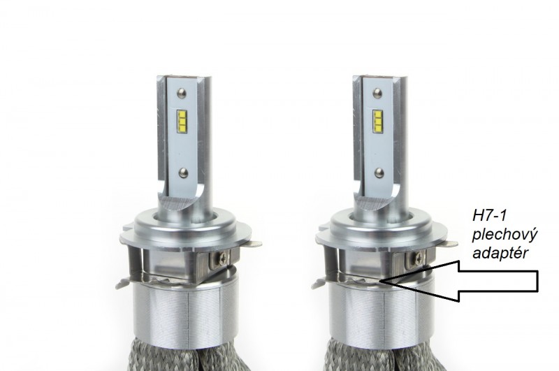 H7-1 nahrazuje žárovku H7 s plechovým adaptérem na objímce. Tuto sadu objednávejte pokud vaše uchycení žárovky je zapomocí plechového plíšku na žárovce a pootočením. Typ H7-1 má plechový adaptér, který pasuje na novější modely Opel, VW, Škoda, Renault apd.