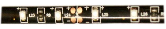 LED pásek, zelené SMD led. 60xLED na 1 metru délky. Možnost zkracování za každou třetí LED (5cm). Maximální délka vcelku 5metrů. Napájení 12V, 2,8W (1metr). Spodní část samolepící fólie 3M. Při délce kratší, jak 5.metrů je nutno napájet přívodní drátky na vyznačené body na počátku pásku. Cena za množství 1x = 1metr. Lepící páska 3M.