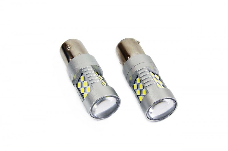 Led žárovka nahrazující žárovku 12V/24V 21W s kovovou paticí Ba15S. Žárovka obsahuje CANBAS, který vyrušuje chybové hlášení u novějších typů vozidel. 24x led v různých směrech a lupou ve přední části. Viz Foto.