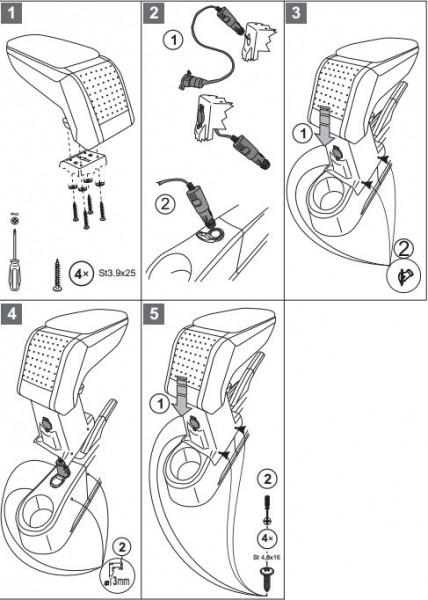 V sadě je zásuvka na 12V a propojovací kabel, aby jste nahradila zásuvka 12V, kterou opěrkou překryjete. Nová zásuvka je zabudovaná v opěrce.