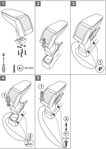 Opěrky jsou vyrobeny přesně na daný typ vozu. Montáž se provádí pomocí přiložených šroubů, přišroubováním ke středovému tunelu. Tělo opěrky je vyrobeno z velice odolného plastu s pevným kloubem. Opěrky mají zatížení až na 80kg, jsou testovány a mají certifikát ISO 9001.