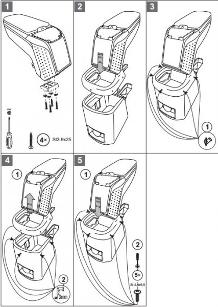 Opěrky jsou vyrobeny přesně na daný typ vozu. Montáž se provádí pomocí přiložených šroubů, přišroubováním ke středovému tunelu. Tělo opěrky je vyrobeno z velice odolného plastu s pevným kloubem. Horní otevírací část je potažena měkkou omyvatelnou koženkou. Vnitřní část je potažena flockem, nebo semišem.