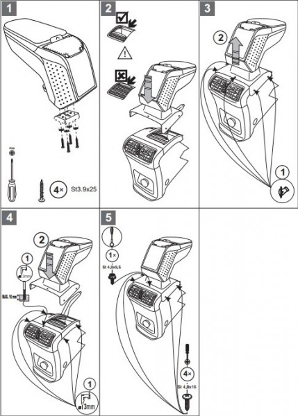 Opěrky jsou vyrobeny přesně na daný typ vozu. Montáž se provádí pomocí přiložených šroubů, přišroubováním ke středovému tunelu. Tělo opěrky je vyrobeno z velice odolného plastu s pevným kloubem. Horní otevírací část je potažena měkkou omyvatelnou koženkou. Vnitřní část je potažena flockem, nebo semišem.