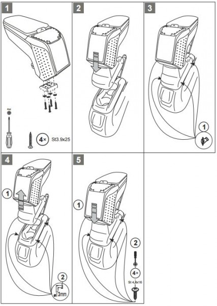 Opěrky jsou vyrobeny přesně na daný typ vozu. Montáž se provádí pomocí přiložených šroubů, přišroubováním ke středovému tunelu. Tělo opěrky je vyrobeno z velice odolného plastu s pevným kloubem. Horní otevírací část je potažena měkkou omyvatelnou koženkou. Vnitřní část je potažena flockem, nebo semišem.