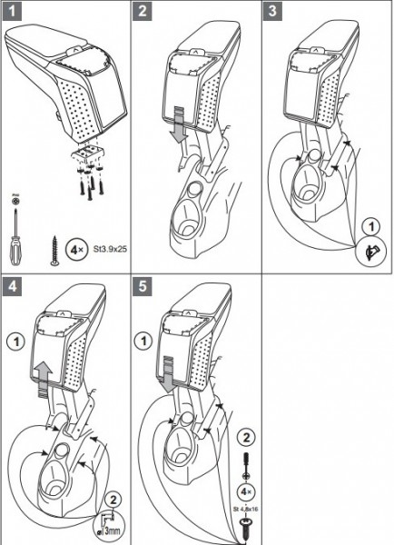 Opěrky jsou vyrobeny přesně na daný typ vozu. Montáž se provádí pomocí přiložených šroubů, přišroubováním ke středovému tunelu. Tělo opěrky je vyrobeno z velice odolného plastu s pevným kloubem. Horní otevírací část je potažena měkkou omyvatelnou koženkou. Vnitřní část je potažena flockem, nebo semišem.