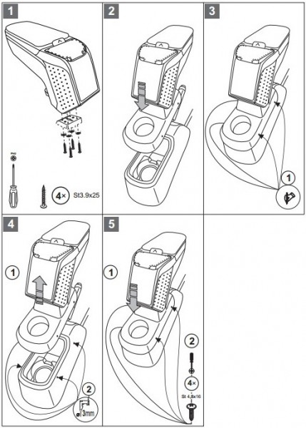 Opěrky jsou vyrobeny přesně na daný typ vozu. Montáž se provádí pomocí přiložených šroubů, přišroubováním ke středovému tunelu. Tělo opěrky je vyrobeno z velice odolného plastu s pevným kloubem. Horní otevírací část je potažena měkkou omyvatelnou koženkou. Vnitřní část je potažena flockem, nebo semišem.