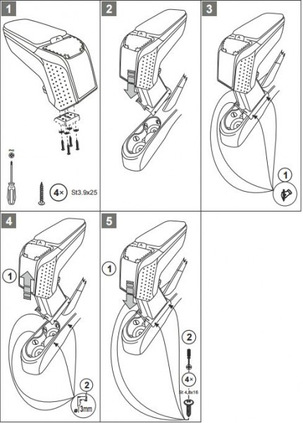 Opěrky jsou vyrobeny přesně na daný typ vozu. Montáž se provádí pomocí přiložených šroubů, přišroubováním ke středovému tunelu. Tělo opěrky je vyrobeno z velice odolného plastu s pevným kloubem. Horní otevírací část je potažena měkkou omyvatelnou koženkou. Vnitřní část je potažena flockem, nebo semišem.