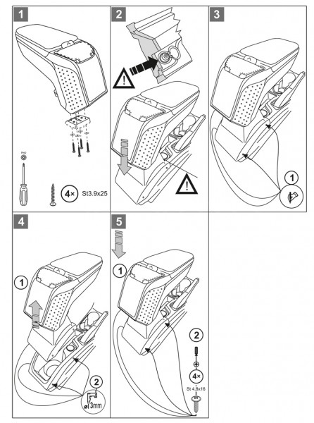 Opěrky jsou vyrobeny přesně na daný typ vozu. Montáž se provádí pomocí přiložených šroubů, přišroubováním ke středovému tunelu. Tělo opěrky je vyrobeno z velice odolného plastu s pevným kloubem. Horní otevírací část je potažena měkkou omyvatelnou koženkou. Vnitřní část je potažena flockem, nebo semišem.