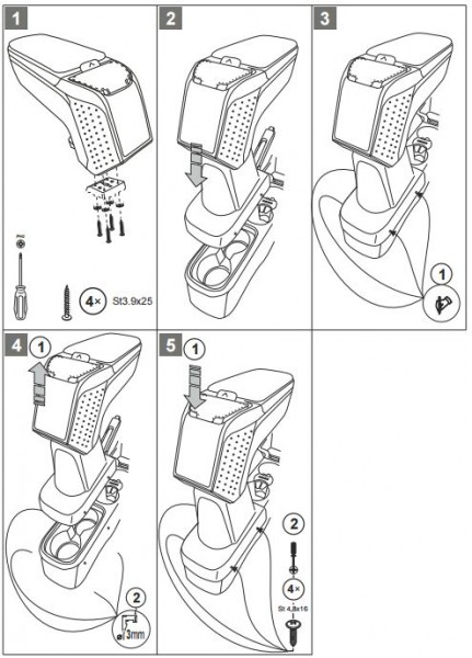 Opěrky jsou vyrobeny přesně na daný typ vozu. Montáž se provádí pomocí přiložených šroubů, přišroubováním ke středovému tunelu. Tělo opěrky je vyrobeno z velice odolného plastu s pevným kloubem. Horní otevírací část je potažena měkkou omyvatelnou koženkou. Vnitřní část je potažena flockem, nebo semišem.