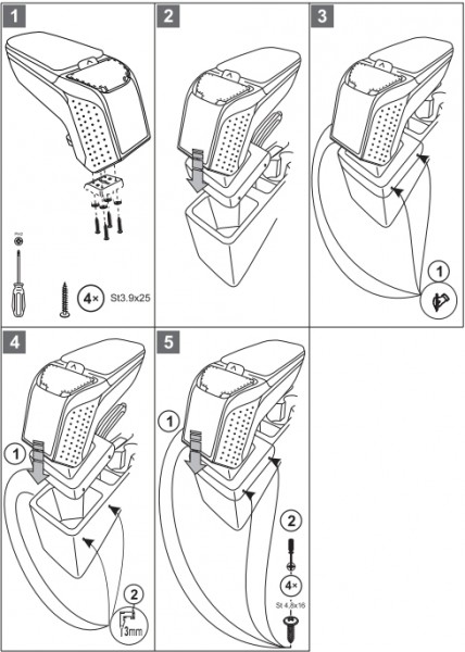 Opěrky jsou vyrobeny přesně na daný typ vozu. Montáž se provádí pomocí přiložených šroubů, přišroubováním ke středovému tunelu. Tělo opěrky je vyrobeno z velice odolného plastu s pevným kloubem. Horní otevírací část je potažena měkkou omyvatelnou koženkou. Vnitřní část je potažena flockem, nebo semišem.