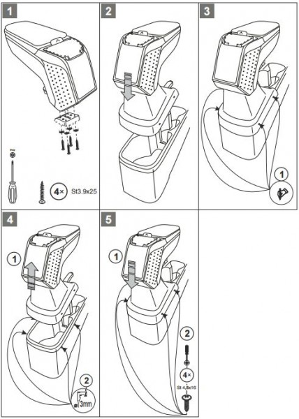 Opěrky jsou vyrobeny přesně na daný typ vozu. Montáž se provádí pomocí přiložených šroubů, přišroubováním ke středovému tunelu. Tělo opěrky je vyrobeno z velice odolného plastu s pevným kloubem. Horní otevírací část je potažena měkkou omyvatelnou koženkou. Vnitřní část je potažena flockem, nebo semišem.