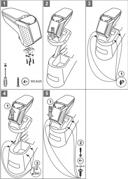 Opěrky jsou vyrobeny přesně na daný typ vozu. Montáž se provádí pomocí přiložených šroubů, přišroubováním ke středovému tunelu. Tělo opěrky je vyrobeno z velice odolného plastu s pevným kloubem. Horní otevírací část je potažena měkkou omyvatelnou koženkou. Vnitřní část je potažena flockem, nebo semišem.