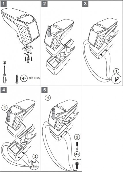 Opěrky jsou vyrobeny přesně na daný typ vozu. Montáž se provádí pomocí přiložených šroubů, přišroubováním ke středovému tunelu. Tělo opěrky je vyrobeno z velice odolného plastu s pevným kloubem. Horní otevírací část je potažena měkkou omyvatelnou koženkou. Vnitřní část je potažena flockem, nebo semišem.