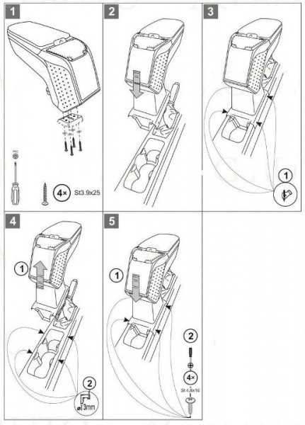 Opěrky jsou vyrobeny přesně na daný typ vozu. Montáž se provádí pomocí přiložených šroubů, přišroubováním ke středovému tunelu. Tělo opěrky je vyrobeno z velice odolného plastu s pevným kloubem. Horní otevírací část je potažena měkkou omyvatelnou koženkou. Vnitřní část je potažena flockem, nebo semišem.