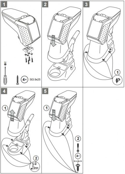 Opěrky jsou vyrobeny přesně na daný typ vozu. Montáž se provádí pomocí přiložených šroubů, přišroubováním ke středovému tunelu. Tělo opěrky je vyrobeno z velice odolného plastu s pevným kloubem. Horní otevírací část je potažena měkkou omyvatelnou koženkou. Vnitřní část je potažena flockem, nebo semišem.