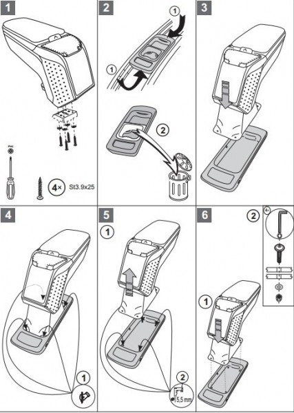 Opěrky jsou vyrobeny přesně na daný typ vozu. Montáž se provádí pomocí přiložených šroubů, přišroubováním ke středovému tunelu. Tělo opěrky je vyrobeno z velice odolného plastu s pevným kloubem. Horní otevírací část je potažena měkkou omyvatelnou koženkou. Vnitřní část je potažena flockem, nebo semišem.
